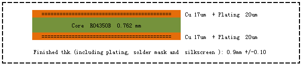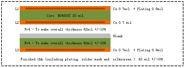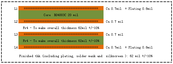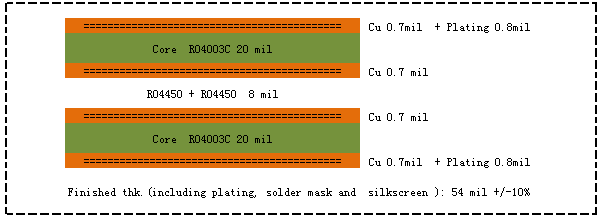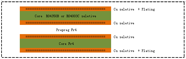 Note:You can use Rogers material in all layers, but normally we need to use core on the outermost layers because Rogers prepreg has insufficient bonding strength with copper foil. Using core on the outer layers prevents poor copper adhesion on the board's surface. Additionally, since signal lines are typically designed on the outer layers, using core there also ensures signal transmission quality.